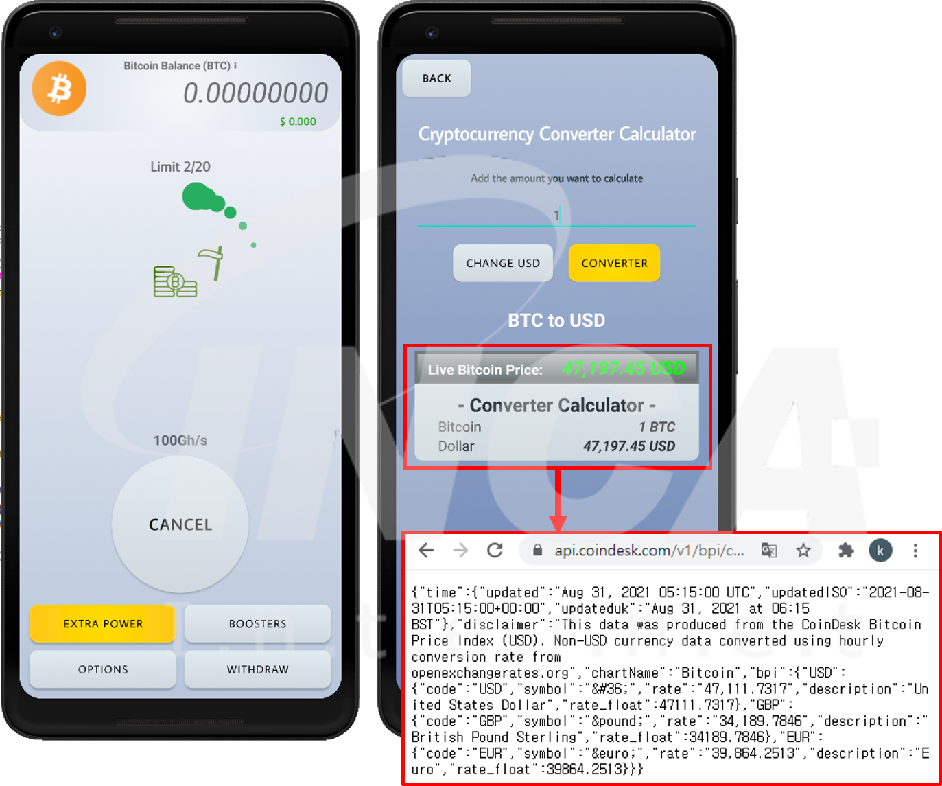 해당 앱은 우측 빨간 상자에서처럼 정상적인 사이트에서 값을 받아오는 등 정상 암호화폐 채굴 앱인 척하지만, 실제 암호화폐 채굴 동작은 하지 못한다.