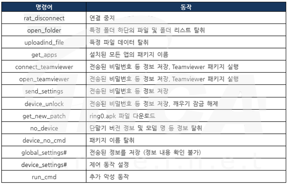 그리고 원격지로부터 'run_cmd' 명령을 받으면, 함께 전송 받은 정보를 통해 아래의 표와 같이 추가적인 악성동작을 수행할 수 있다.