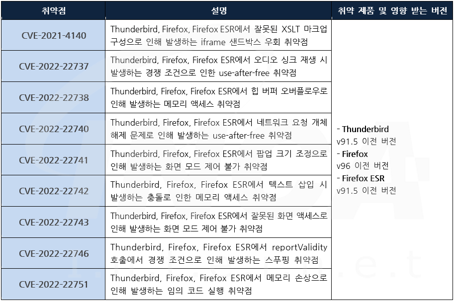 Mozilla 사는 제품에서 발생하는 취약점에 대한 보안 업데이트를 발표하고, 관련 취약점을 해결하기 위해 최신 버전으로 업데이트할 것을 권고하였다.