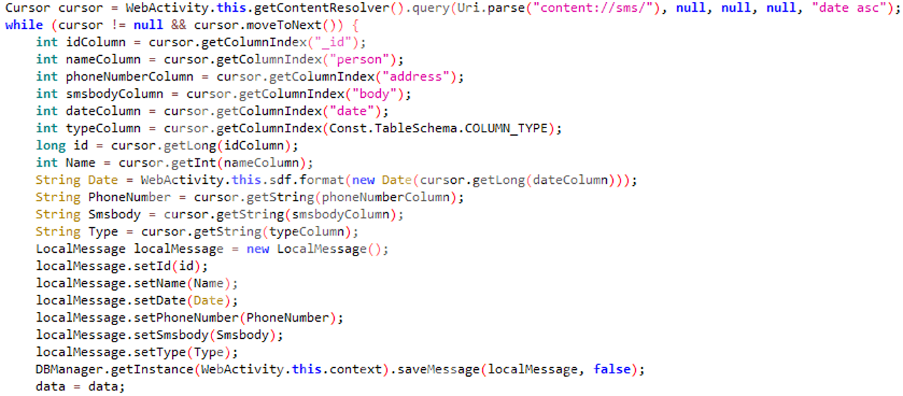 위의 연락처 정보 탈취 동작과 동일하게 SMS 메시지 정보와 이미지 파일 정보를 탈취한다. 문자메시지 정보에서는 이름, 날짜, 전화번호, 문자메시지 내용, 메시지 타입 정보를 획득하고, 이미지 파일 정보에서는 외부저장소에 저장된 이미지 파일의 경로 및 날짜 정보를 획득한다.