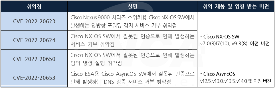 Cisco 사는 제품에서 발생하는 취약점에 대한 보안 업데이트를 발표하고, 관련 취약점을 해결하기 위해 최신 버전으로 업데이트할 것을 권고하였다.
