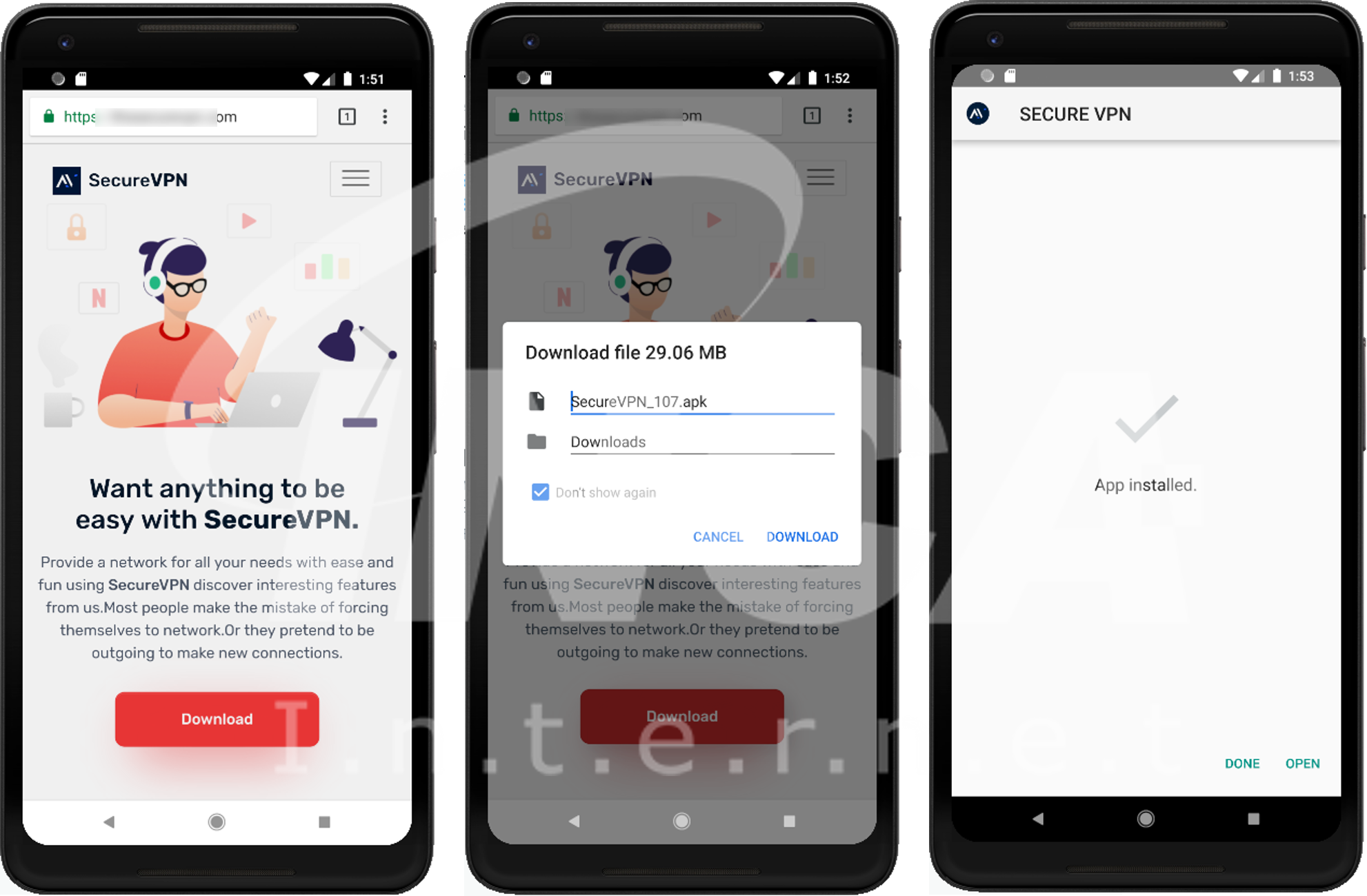 해당 앱은 아래의 화면과 같이 VPN 서비스 업체의 웹 사이트로 위장하여 악성 앱을 유포한다. 해당 웹 사이트의 주소는 정상 서비스 중인 한 VPN 업체의 주소와 유사하다.
