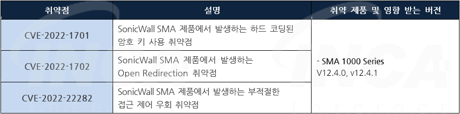 SonicWall 사는 제품에서 발생하는 취약점에 대한 보안 업데이트를 발표하고, 관련 취약점을 해결하기 위해 최신 버전으로 업데이트할 것을 권고하였다.