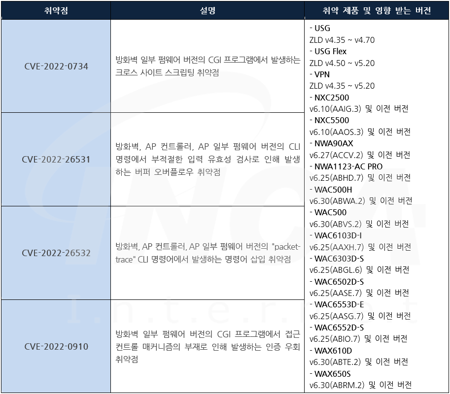 ZYXEL 사는 제품에서 발생하는 취약점에 대한 보안 업데이트를 발표하고, 관련 취약점을 해결하기 위해 최신 버전으로 업데이트할 것을 권고하였다.