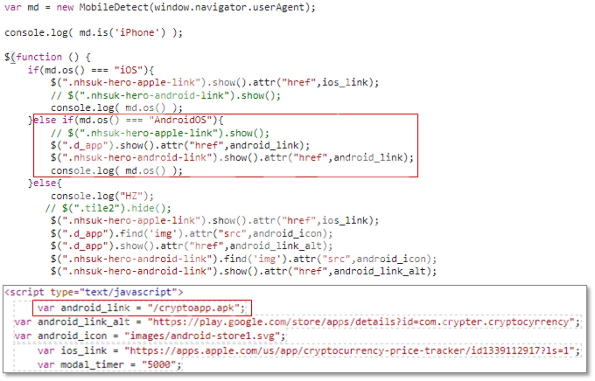 웹페이지를 랜더링하는 장치 정보를 확인하여 AndroidOS인 경우 ‘cryptoapp.apk’를 다운로드하고, iOS또는 그 외의 장치의 경우에는 구글 플레이에서 판매중인 정상 앱을 다운로드한다.
