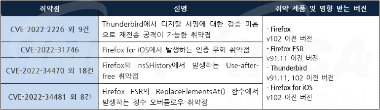 Mozilla 사는 제품에서 발생하는 취약점에 대한 보안 업데이트를 발표하고, 관련 취약점을 해결하기 위해 최신 버전으로 업데이트할 것을 권고하였다.
