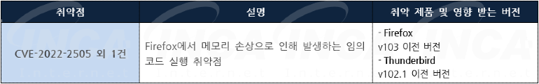 Mozilla 사는 자사 제품에서 발생하는 취약점에 대한 보안 업데이트를 발표하고, 관련 취약점을 해결하기 위해 최신 버전으로 업데이트할 것을 권고하였다.