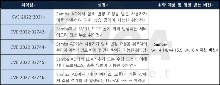 Samba 사는 제품에서 발생하는 취약점에 대한 보안 업데이트를 발표하고, 관련 취약점을 해결하기 위해 최신 버전으로 업데이트할 것을 권고하였다.