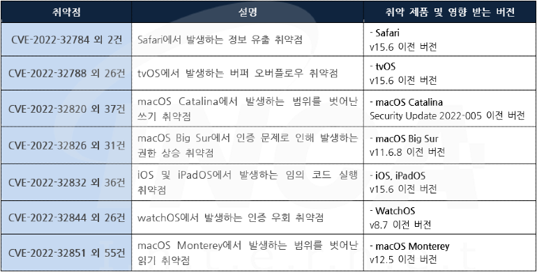 Apple 사는 제품에서 발생하는 취약점에 대한 보안 업데이트를 발표하고, 관련 취약점을 해결하기 위해 최신 버전으로 업데이트할 것을 권고하였다.