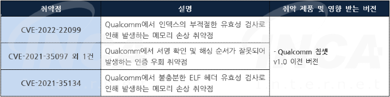 Qualcomm 사는 Android에서 발생하는 취약점에 대한 보안 업데이트를 발표하고, 관련 취약점을 해결하기 위해 최신 버전으로 업데이트할 것을 권고하였다.