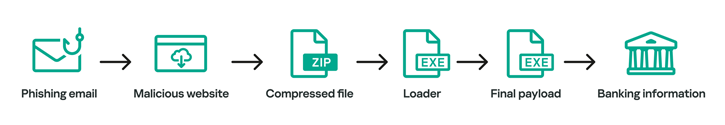 Google의 악성 광고 또는 피싱 메일로부터 공격이 시작되며, 사용자에게 ZIP 아카이브 파일을 다운로드하도록 유도한다. 해당 파일에 포함된 MSI 파일 형태의 로더는 사용자의 시스템에서 지원하는 언어와 샌드박스 환경을 확인하고 악성코드를 다운로드 후 실행한다. 이후, 호스트 정보와 IP 주소 기반의 위치 데이터 및 사용자 활동 정보를 수집하고 공격자의 C&C 서버로 전송한다. 또한, 사용자의 자격 증명을 얻어 금융 앱과 암호화폐 및 기프트 카드 등을 이용해 운반 계좌로 자금을 현금화한다.