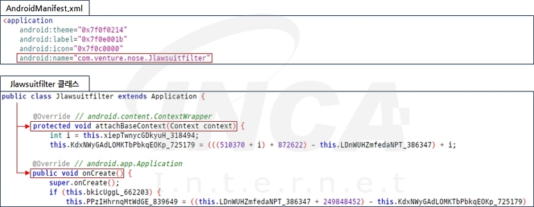 Application 클래스는 실행할 앱의 프로세스가 생성될 때 가장 먼저 인스턴스화되는 기본 클래스로 “TrickMo”는 “AndroidManifest.xml” 파일에 Application을 상속하는 하위 클래스의 이름을 정의하고 있으며 해당 하위 클래스에서 “attachBaseContext()”와 “onCreate()” 메서드가 재정의돼 사용되는 것을 확인할 수 있다.