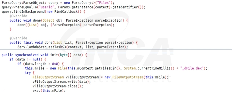 정보 수집 외에도 PasreQuery를 이용해 서버에서 추가 모듈에 대한 ParseObject를 다운로드하고 “_dFile.dex”라는 이름으로 저장 및 실행한다. 단, 분석 시점에서 서버와 연결되지 않아 추가 모듈이 다운로드되지 않았다.