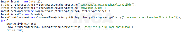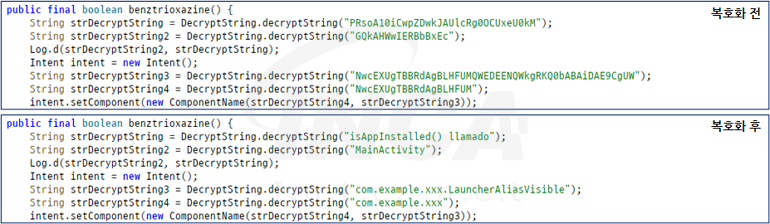 DroidLock 악성 앱의 유포 파일과 해당 파일 내 포함된 추가 APK는 클래스명, 명령어 및 로그 메시지 등의 문자열을 암호화한 상태로 저장하고 있으며 Base64 디코딩 및 XOR 연산으로 복호화해 사용한다. [그림 1]은 APK에서 smali 파일을 추출하고 문자열을 복호화한 후 다시 리패키징한 결과이다.