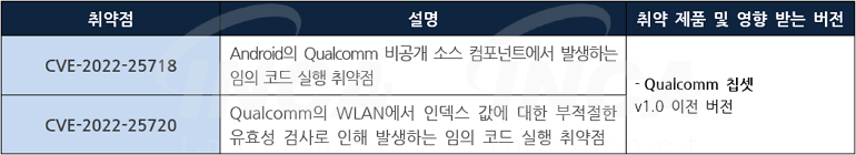 Qualcomm 사는 Android에서 발생하는 취약점에 대한 보안 업데이트를 발표하고, 관련 취약점을 해결하기 위해 최신 버전으로 업데이트할 것을 권고하였다.