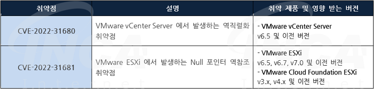 VMware 사는 제품에서 발생하는 취약점에 대한 보안 업데이트를 발표하고, 관련 취약점을 해결하기 위해 최신 버전으로 업데이트할 것을 권고하였다.
