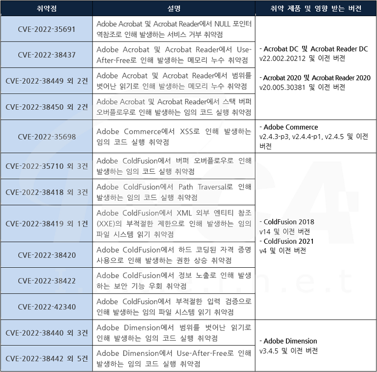 Adobe 사는 제품에서 발생하는 취약점에 대한 보안 업데이트를 발표하고, 관련 취약점을 해결하기 위해 최신 버전으로 업데이트할 것을 권고하였다.