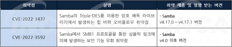 Samba 사는 제품에서 발생하는 취약점에 대한 보안 업데이트를 발표하고, 관련 취약점을 해결하기 위해 최신 버전으로 업데이트할 것을 권고하였다.
