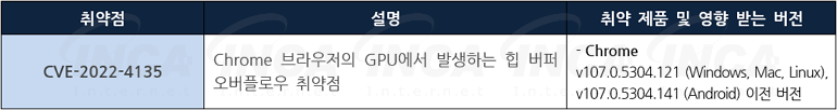 Google 사는 Chrome에서 발생하는 취약점에 대한 보안 업데이트를 발표하고, 관련 취약점을 해결하기 위해 최신 버전으로 업데이트할 것을 권고하였다.