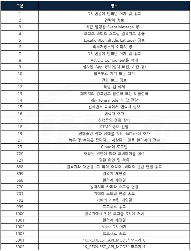 그 외에도 수신되는 문자메시지를 확인하여 해당 정보를 탈취하고, 수•발신 전화의 정보를 탈취하는 등의 동작을 수행한다. 해당 정보 탈취 동작은 아래의 우측 코드에서 보는 것과 같이, 원격지에서 관련 동작을 수행할지 할 것인지 않을 것인지에 대한 값을 받아오면 진행된다.