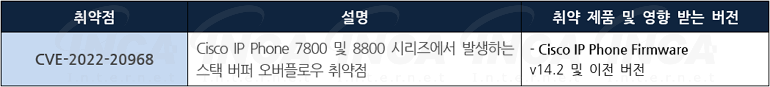 Cisco 사는 제품에서 발생하는 취약점에 대한 보안 업데이트를 발표하고, 관련 취약점을 해결하기 위해 최신 버전으로 업데이트할 것을 권고하였다.