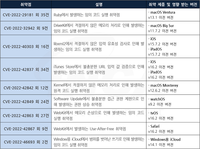 Apple 사는 자사 제품에서 발생하는 취약점에 대한 보안 업데이트를 발표하고, 관련 취약점을 해결하기 위해 최신 버전으로 업데이트할 것을 권고하였다.