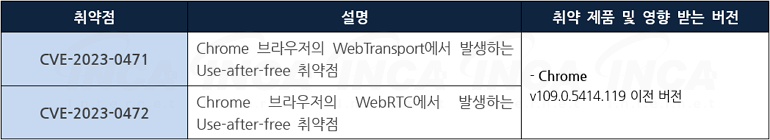 Google 사는 Chrome에서 발생하는 취약점에 대한 보안 업데이트를 발표하고, 관련 취약점을 해결하기 위해 최신 버전으로 업데이트할 것을 권고하였다.