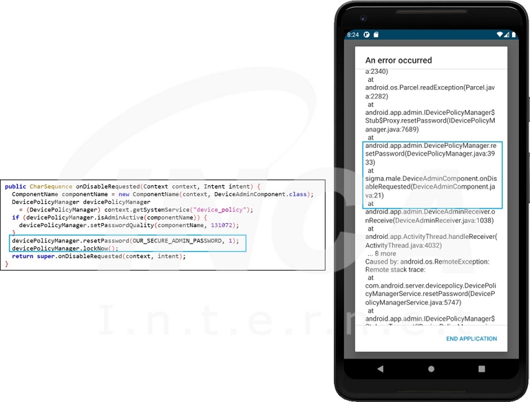 이때, Admin 권한을 획득했다가 Disable 요청 이벤트가 발생되면 사용자 단말기 잠금 암호를 1234로 설정하고 Lock 해버린다. 분석 환경에서는 하단 우측 그림과 같이 에러가 발생하여 정상적으로 동작하지 않는다.