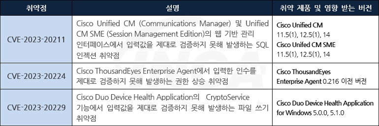 Cisco 사는 자사 제품에서 발생하는 취약점에 대한 보안 업데이트를 발표하고, 관련 취약점을 해결하기 위해 최신 버전으로 업데이트할 것을 권고하였다.