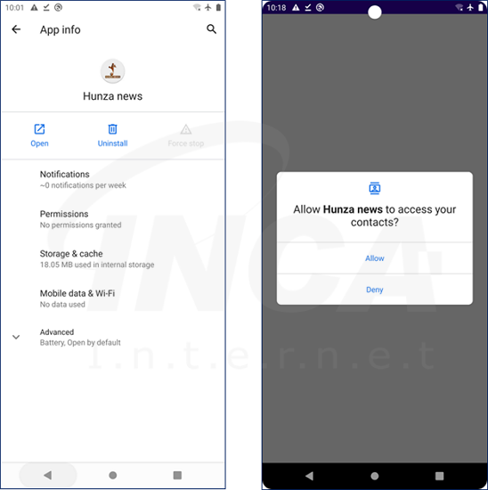 Hunza News 앱으로 위장한 Kamran 스파이웨어를 실행하면, 처음에 연락처, SMS 메시지, 통화 기록 및 로컬 저장소 등에 접근할 수 있는 과도한 권한을 요구한다.