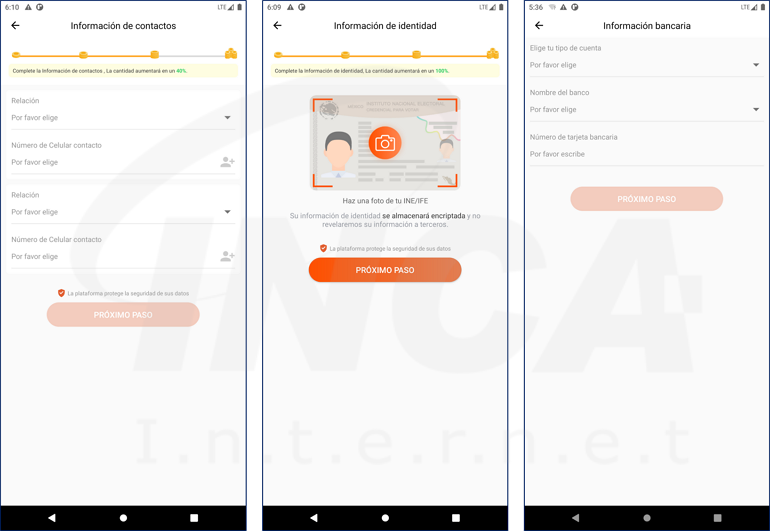 이후, 대출에 필요한 과정인 것처럼 사용자를 속여 연락처, 신분증 및 은행 정보 등 민감한 정보를 입력하도록 유도한다.
