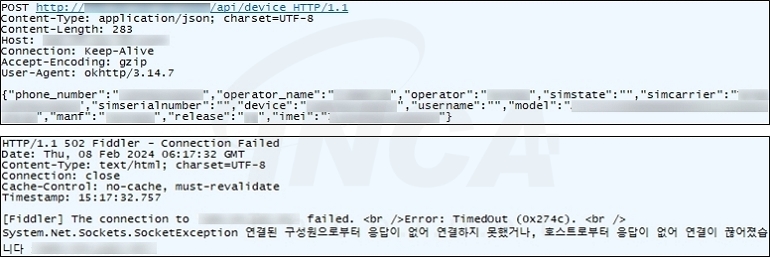 수집된 데이터는 디바이스 정보부터 순차적으로 공격자의 C&C 서버로 전송된다. 하지만, 분석 시점에서 서버가 연결되지 않아 디바이스 정보를 제외한 다른 데이터는 전송되지 않았다.