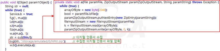 실행된 Dex 파일은 사용자 디바이스에서 디바이스 정보, 연락처 및 SMS 메시지 등의 정보를 수집하며, 추가로 다음 경로에서 디지털 인증서 파일을 찾는다. [그림 4]는 디지털 인증서 수집 코드로, 코드 사이에 삽입된 더미 데이터를 제거한 후 실제 실행과 관련된 코드를 재조합했다.