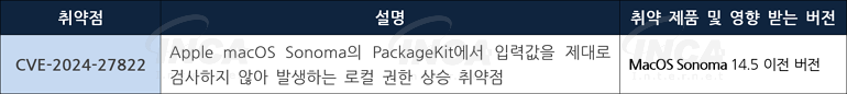 Apple 사는 제품에서 발생하는 취약점에 대한 보안 업데이트를 발표하고, 관련 취약점을 해결하기 위해 최신 버전으로 업데이트할 것을 권고하였다.